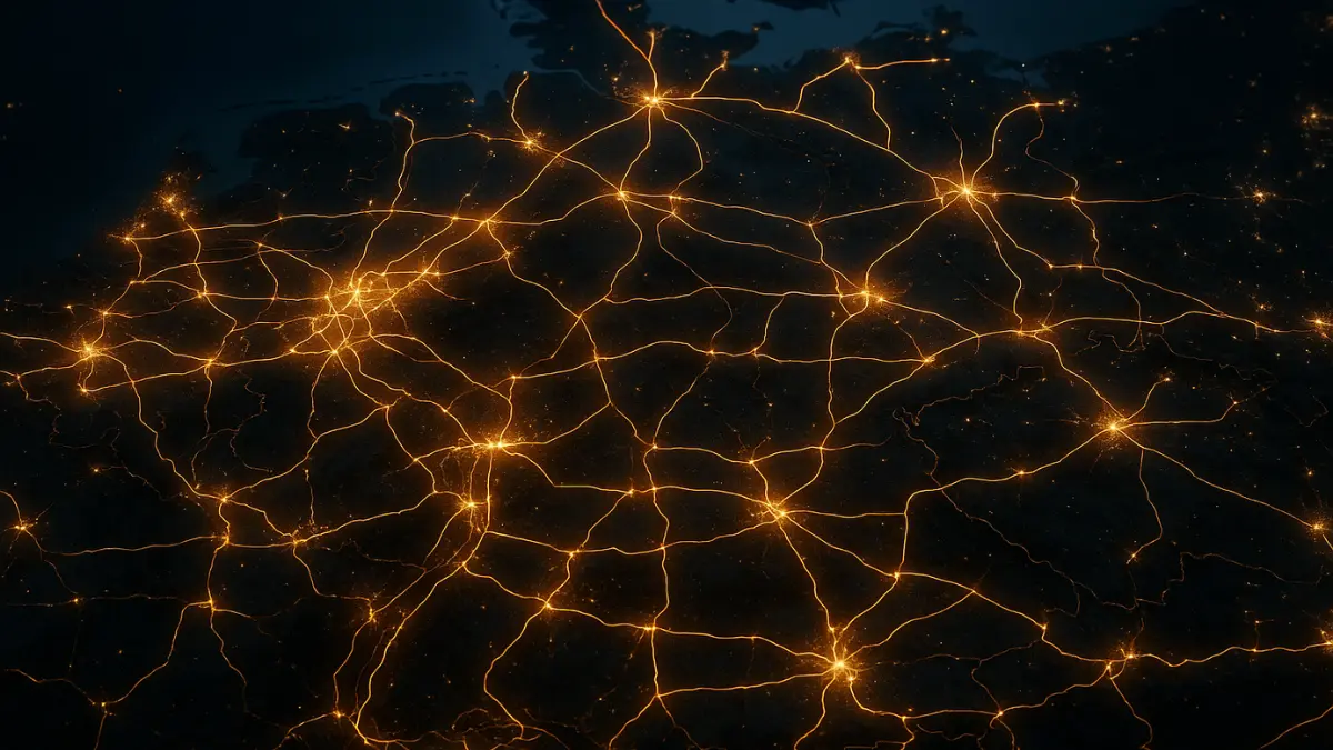 Großstadt bei Nacht mit leuchtendem Netzwerk aus verbundenen Linien und Knotenpunkten.
